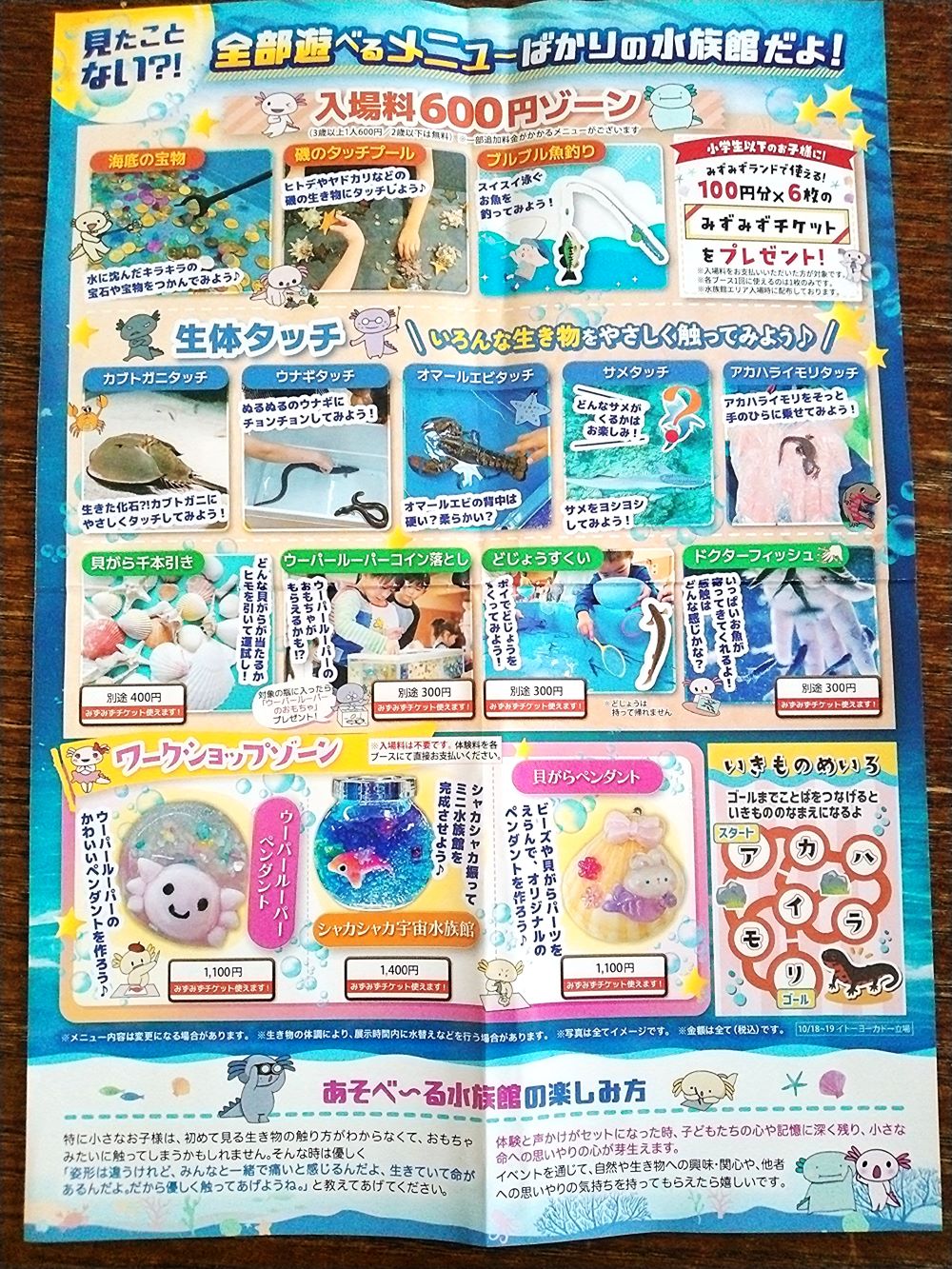 ペンダントやミニ水族館作りなどのワークショップは、入場料は掛からず、各メニュー体験料がかかるシステムのようです。